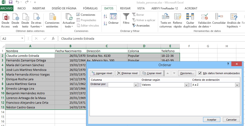 Nombre y haga clic en aceptar, lo nombres quedaran ordenados así