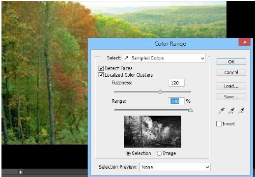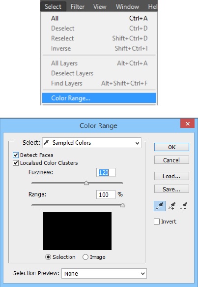 Pase al menú Seleccionar ->Rango de color (Select -> Color Range ...) Corre la Tolerancia (Fuzziness) hasta 120