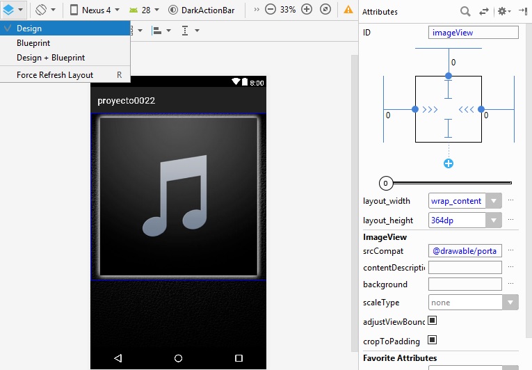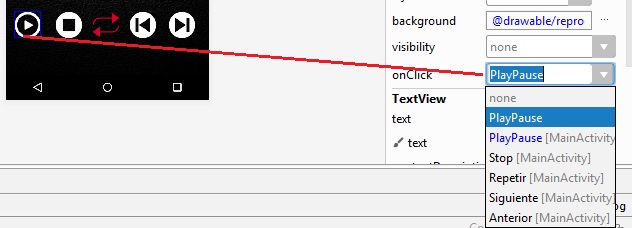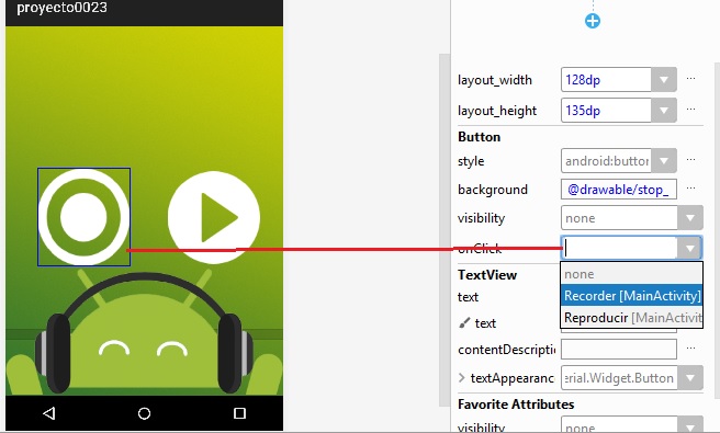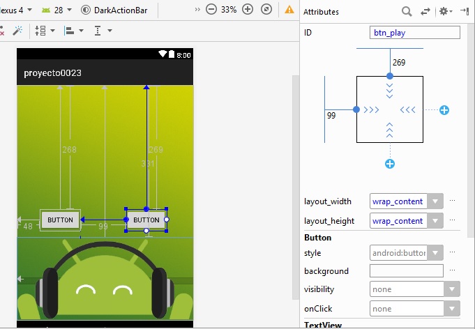 layout_height a 128dp, y al botón btn_play, se agrega la imagen en