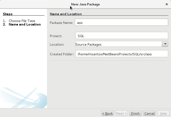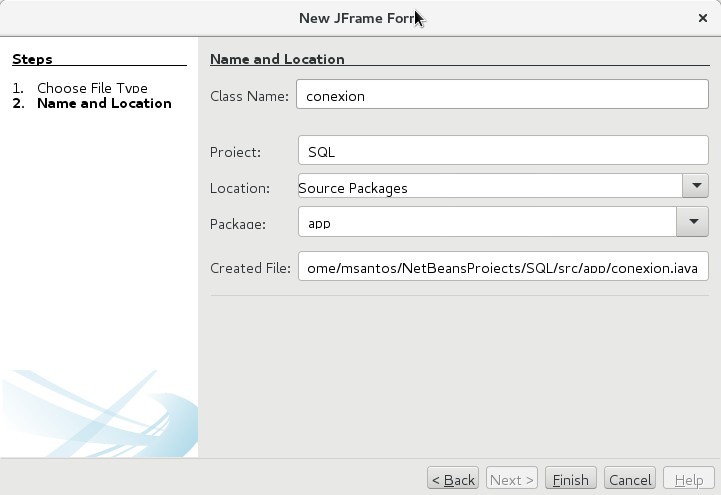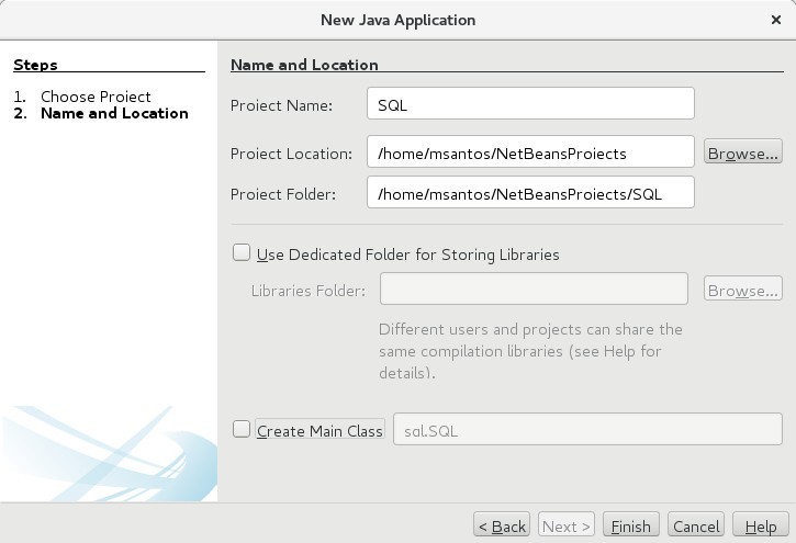 Le establecemos el nombre como SQL, y no creamos la clase principal (se retira la marca Create Main Class):