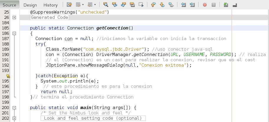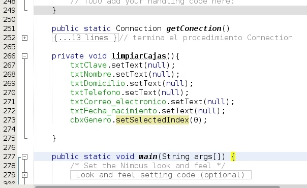 Formemos el codigo para limpiar los campos (cajas de datos) se agrega despúes de public static Connection getConection()